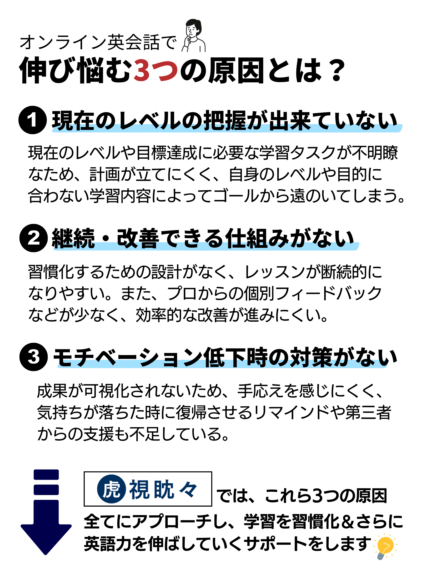 虎視眈々は「オンライン英会話をやっても英語が伸びない」という方のための英語コーチングです。日々の学習に続けられる仕組みと効果的な学習方法を用いることで「学習が続かない」「学習しても伸びない」という悩みを解消します。オンライン英会話の受講生や、独学で学んでいるけれど学習アドバイスを受けられない方にとって、成果が出せる英語学習のセカンドサービスとして設計されています。