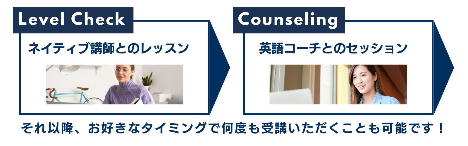 ⚫︎ 入会後は初回グループコーチング(GC)に入る前に、ネイティブ講師による英語レベルチェックとコーチとの個別セッションを受講いただきます。(目標の設定と学習内容の策定に役立ちます)
